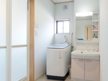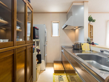 N様邸での大きな変更点は、ご主人からのリクエストで、標準より広くした洗面脱衣室。約1.5倍の広さとなり、ドライルームとしても便利に使っていただけています。また、リビング南面の掃き出しの大窓や、家の中心に寄せたキッチン勝手口などは、方位学を取り入れた間取りの変更となっており、これもN様邸ならではの特徴です。