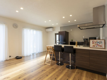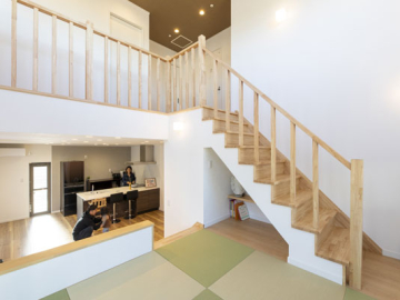 間取りのラフスケッチや必須項目をまとめたメモを作成するなど、最初から家づくりに積極的に参加してくださった奥様が一番にこだわった部分が、やはり暮らしの中心となるLDKです。とりわけベースモデル(間取り)の大幅な見直しによって実現したスキップフロアが最大の見どころ。客間としても利用できる4 帖半の広さがそのまま屋根裏まで吹き抜ける開放的な設計で、スキップフロアを介して2 段階に分かれた階段下スペースを、それぞれお子様の学習コーナーと小物置き場に充てるなど、細部にまで奥様のアイディアが光ります。