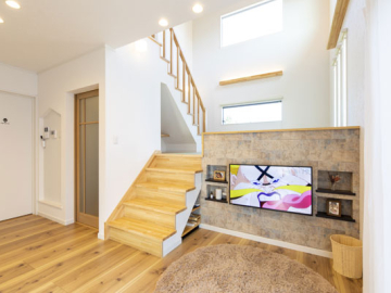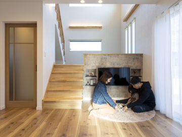 家を建てるならスキップフロアのある家と決めていました。大きな窓からたっぷり光が入ってくる吹き抜けの空間も気持ちいいし、フロアの立ち上がりを利用したTV コーナーもおしゃれな感じに仕上がったし、とにかくどこをとっても大満足です。