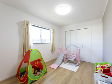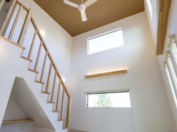 2階にはL字型のホールを介して、主寝室と子供部屋など3部屋とトイレを配置。吹き抜けの開放感と明るさをたっぷり取り込んだ2 階ホールは、たんなる動線ではなく、ご家族の共有スペースとしても十分な広さがあり、さらに室内干し機能など、ユーティリティ性能も備えました。