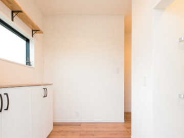本物件は基本モデルの「DOハウス 980LL」を元に玄関スペースや洗面室にゆとりを持たせているのが特長です。特に家事室兼用で広くした洗面室は、小さなお子様のいるM家にとっては、洗濯から下着類の整頓までここだけでこなせる空間にもなり、玄関土間もレジャー&アウトドアグッズの収納として大活躍してくれそうです。