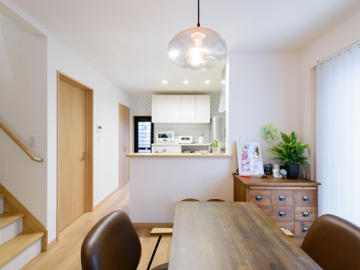 照明器具をはじめ、ソファやダイニングテーブル、アンティーク調タンスといった以前からのオーナー愛用品をそのまま活かしたリビングは特にこだわられた部分で、シンプルなホワイト系で統一されたクロスに対し、フロアは1階にオーク柄の明るいフローリングを、2階には白い木目調を採用。また、リビング壁のアクセントには淡いグリーンでカジュアルな演出を。さらにキッチン背面にはタイル調のアクセントクロスはN様お気に入りのポイントです。室内の全体的な色合わせについては、持ち込まれた愛用品との調和を大切にするため、前居のリビングを撮影した写真が大いに参考になりました。
