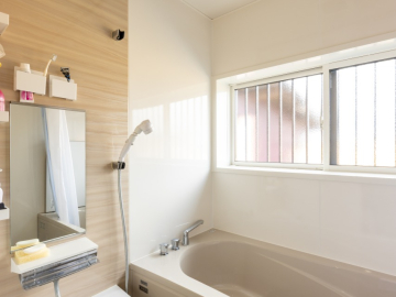 間取りを変えずにリニューアルした浴室は、古い土間部分を取り込んでさらに使いやすくなりました。特に洗面脱衣室は、愛犬の洗い場として使えるほどの広さで、その一角には裏庭に設置した半屋外物干し場への出入口を新設したりと、現代的な家事動線も実現しました。