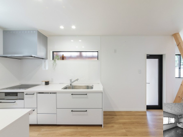 114坪の角地という恵まれた条件の土地に建つ中古住宅のリノベーション物件です。ベースとなった住宅は築32年という古さもあり、主に床まわりの老朽化が進行していたため、全室床の張り替えを行い、他にも外壁面や床、天井の断熱改修やペアガラスサッシへの交換をすることで快適な住宅に生まれ変わりました。また、電動シャッター付きのガレージが備わっているのが、中古物件ならでは。普通車2台を格納できる大きさで、雨の日でも濡れずに家の中に入れるのが便利です。
