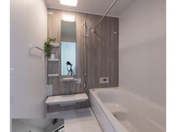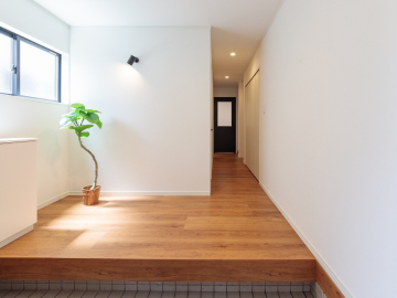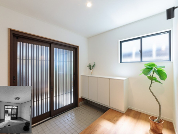 平成初期の住宅らしい立派な構えの玄関周りは、天井、壁、床などの内装を一新し、玄関戸も交換。LDKへ続く長い廊下の途中にあるバス・トイレの配置は旧間取りのまま活かし、広さをプラスして浴室は1坪サイズを、洗面脱衣室には部屋干し機能を追加して家事のしやすい広さを確保しました。